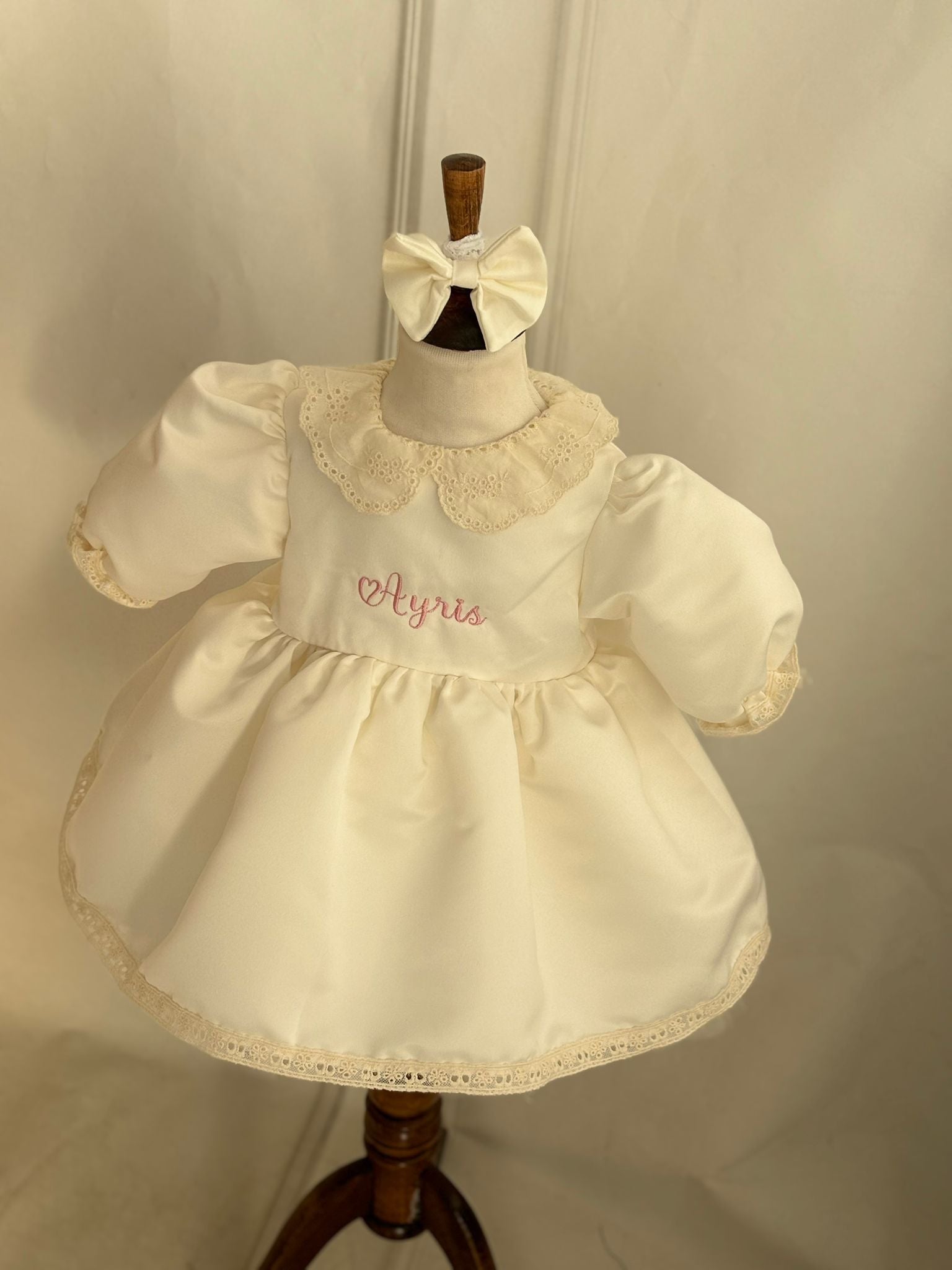 Luxury Personalized Baby Dress with Name Embroidery – Cream Satin Toddler & Girl Dress