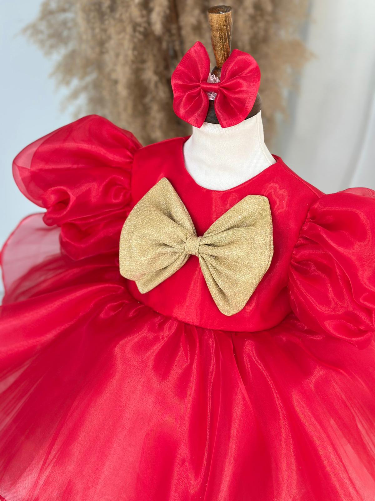 Turn every celebration into a magical moment with this stunning red and gold baby girl party dress. Featuring dramatic puffy organza sleeves, a layered red tulle skirt, and a dazzling gold bow detail on the bodice, this elegant dress is designed to make your little one stand out.